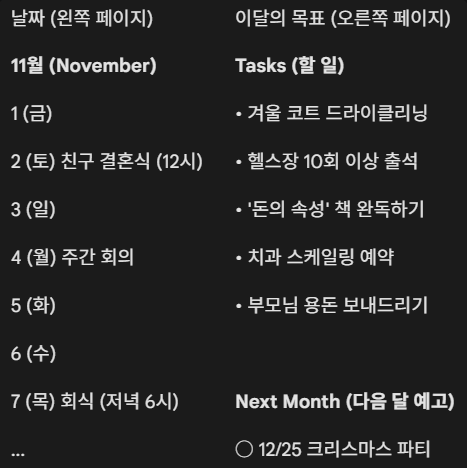 - 먼슬리 로그 (Monthly Log): 이번 달 달력과 그달의 목표 기록