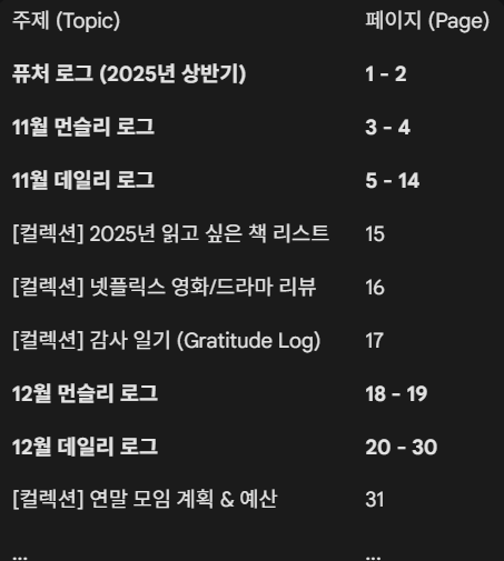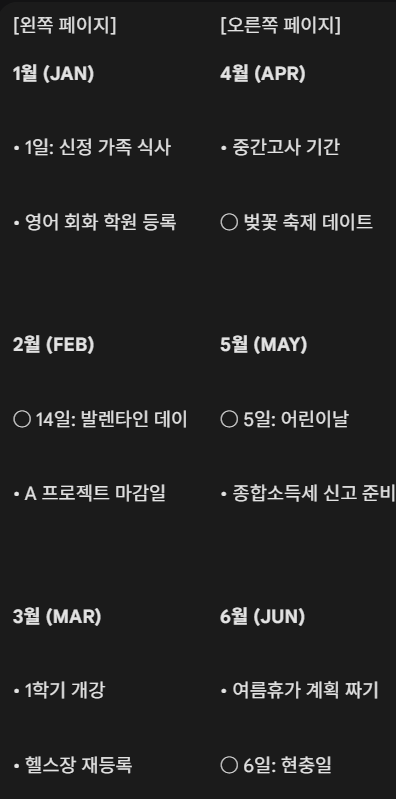 - 퓨처 로그 (Future Log): 6개월~1년 치의 큰 숲을 봅니다. 월별 일정이나 목표 기록