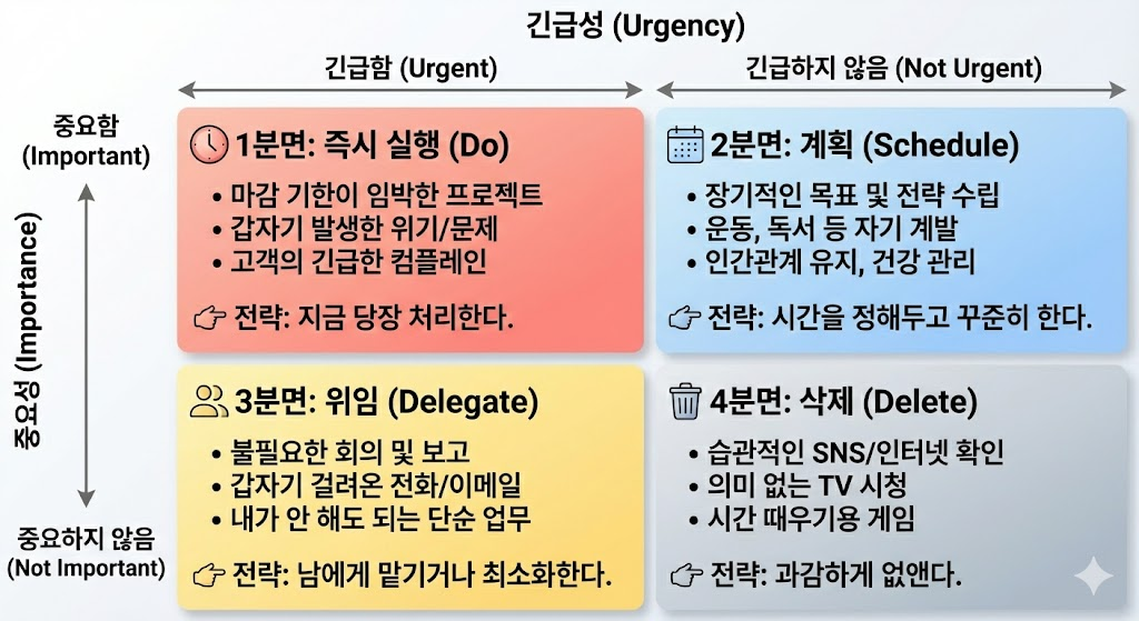 따라서, 단독 작업성격의 To-do인 경우이거나 동일 시간상에서 처리하는 경우에는 우선순위 설정을 통해서 작업들을 빨리 처리해야 하는 상황이 생긴다. 이러한 경우에 우선순위 설정을 어떻게 하지 하는 고민이 있었다. 그러다가 우연히 아이젠하워 매트릭스를 알게 되었다. 대부분의 사람들이 사실 어느정도는 알고 있을 것이라고 생각하는 내용인데, 그것을 좀 더 체계화시켰다라고 보는 것이 좋을 거 같다.